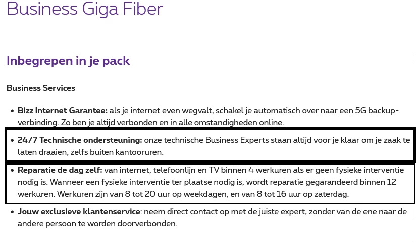 Wanneer er geadverteerd wordt met 24/7 technische ondersteuning voor zakelijke klanten, mag men er redelijkerwijs van uitgaan dat dit alle essentiële zakelijke diensten omvat, waaronder ook Business Call Connect. Indien bepaalde diensten uitgesloten zijn van ondersteuning buiten de kantooruren, dan zou dit duidelijk en expliciet vermeld moeten worden bij de abonnementsvoorwaarden. Op dit moment komt de communicatie niet overeen met de effectieve dienstverlening.