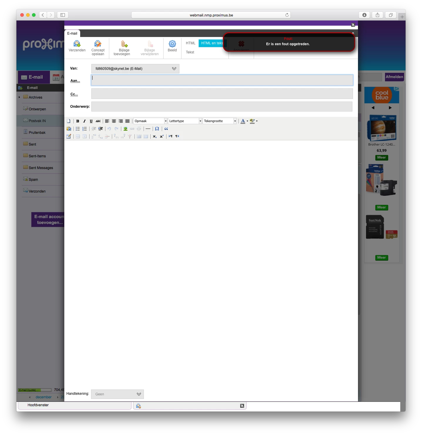 Voor mijn mails maak ik gebruik van de mailapplicatie die bij My Proximus zit. Helaas stel ik iedere keer weer vast dat ik hier dubbel zoveel tijd over doe dan wat normaal verwacht wordt. Dit komt omdat ik bij om het even wat (mails openen, mails doorsturen of beantwoorden) iedere keer weer een vervelende foutmelding op mijn scherm zie verschijnen. Vanavond alleen al ben ik hierdoor al een halfuur kwijt, omdat ik telkens meerdere malen een mail moet heraanklikken of bij het doorsturen vast stel dat ik een blanco bericht verzend... Doe hier dus wat aan!!!