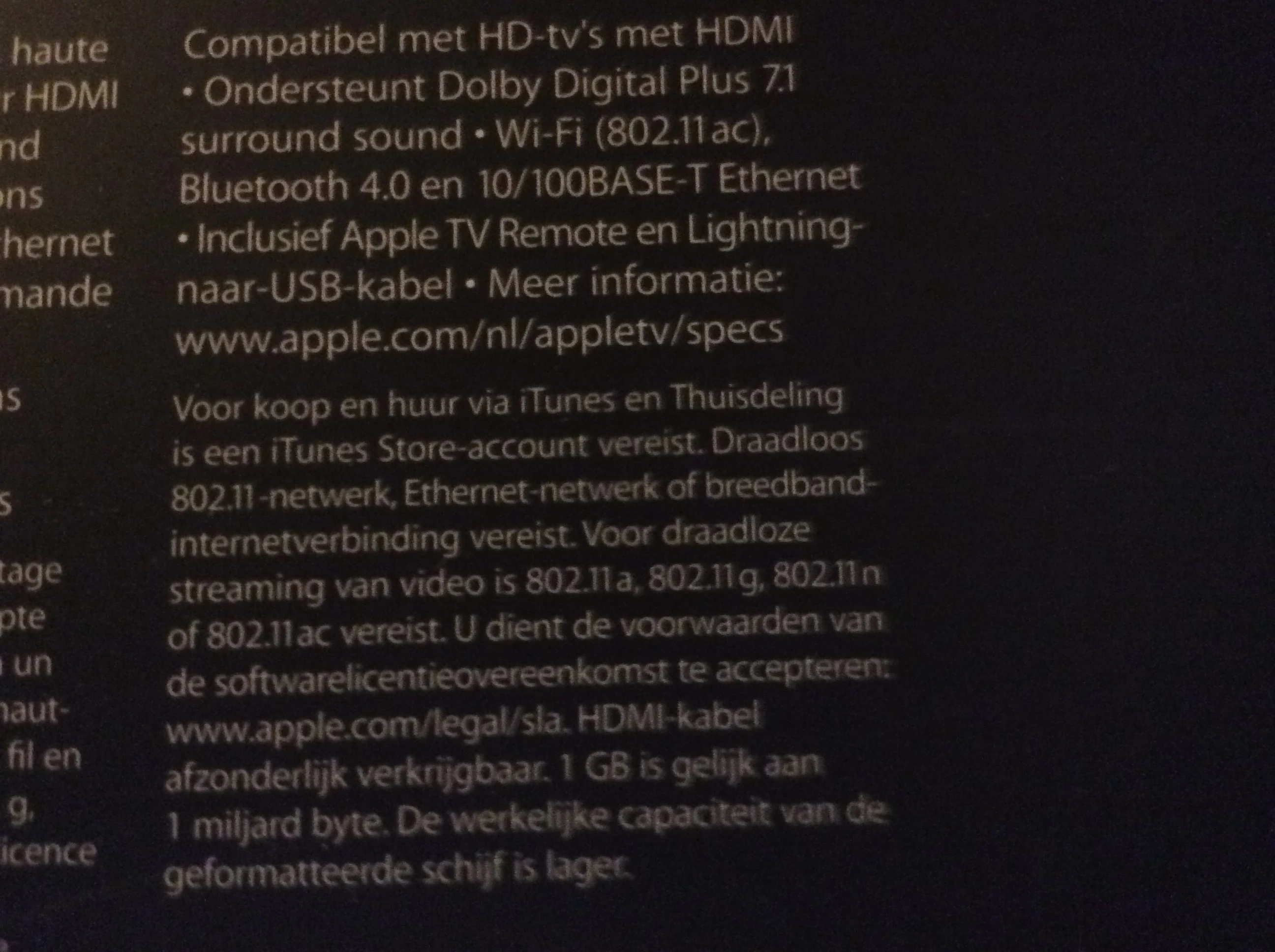 Blijkbaar kan ik nu niet meer draadloos video's streamen op de Apple Tv omdat het netwerk niet ondersteund wordt. In bijlage de tekst die op de doos van de Apple Tv (zwarte doos, hopelijk tekst leesbaar) vermeld staat. Als ik het goed begrijp, kan ik nu niet meer draadloos streamen? En moet ik een ethernet-kabel aansluiten? Heel vervelend, mijn Apple doosje moet vlakbij de tv staan, maar die staat "mijlenver" van de router verwijderd;-(