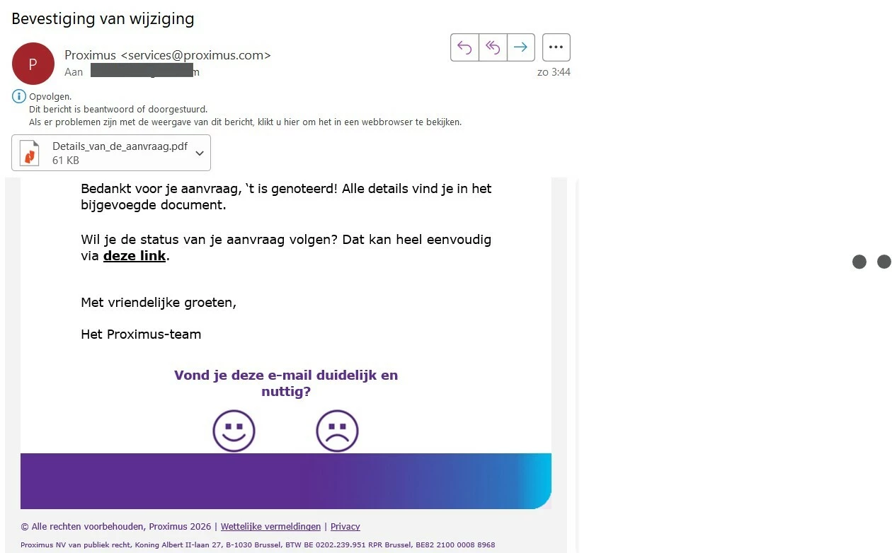 Een 3-tal dagen geleden een mail gekregen van Proximus.com. (services@proximus.com)