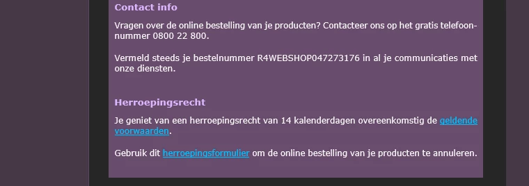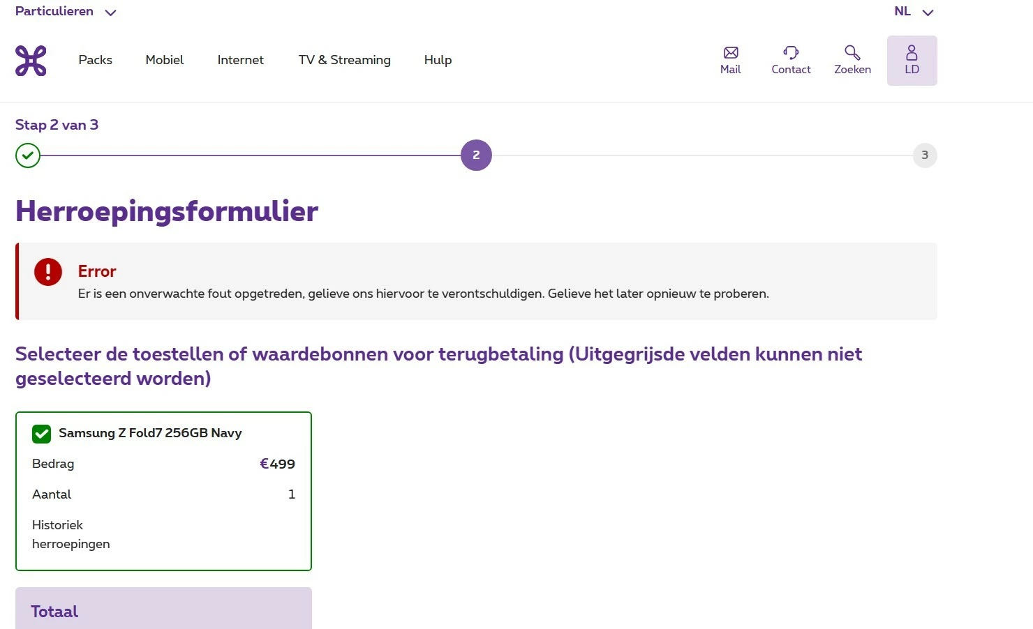 Reeds 3 dagen probeer ik gebruik te maken van de link herroepingsrecht. Nog steeds na het correct invullen van de gegevens komt er