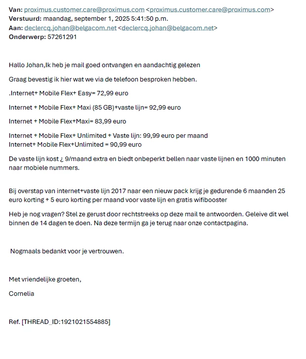 Ik ben in september als trouwe klant overgeschakeld naar een ander pack, hierbij werd mij de eerste 6 maand een korting van 25€ per maand beloofd, zowel via mail als telefonisch (zie mail onderaan)