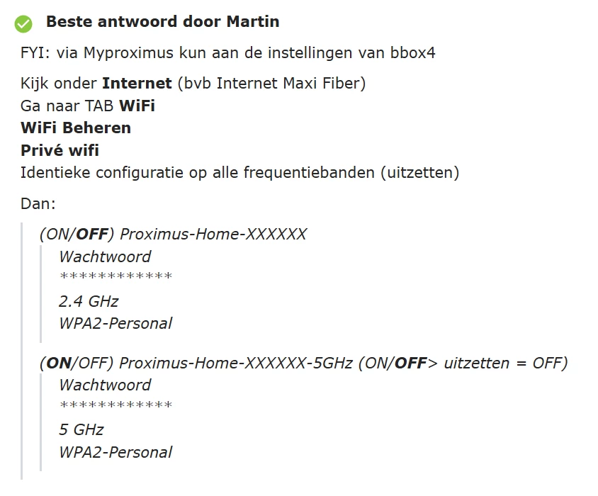 Ik heb alles gedaan wat ik vinden kon, maar ik heb op Myproximus geen tabblad wifi om mijn 5GHZ band uit te schakelen. Kan iamand hierbij helpen?