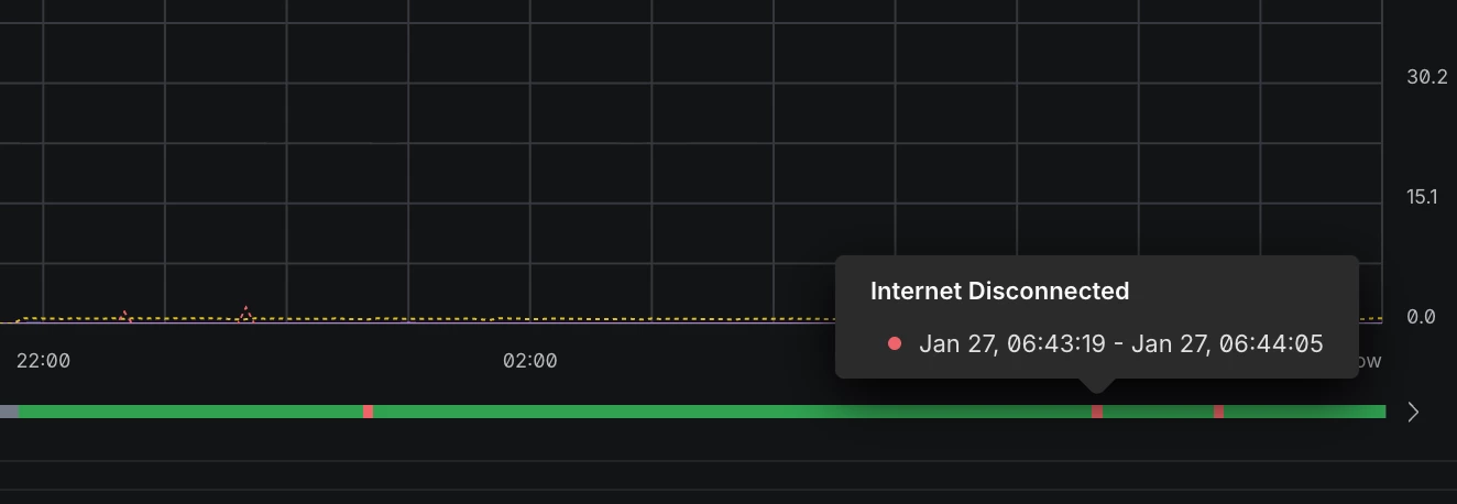 Ik stuur ook een screenshot mee van de onderbrekingen van afgelopen nacht/ochtend tussen 22h en 9h, waren er 3: op 27/01 om 00:43:40, 06:43:19 en 07:43:35.