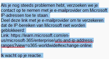 Zo niet, deel dan deze link met je e-mailprovider om te verzekeren dat de IP-bereiken van Microsoft niet worden geblokkeerd: