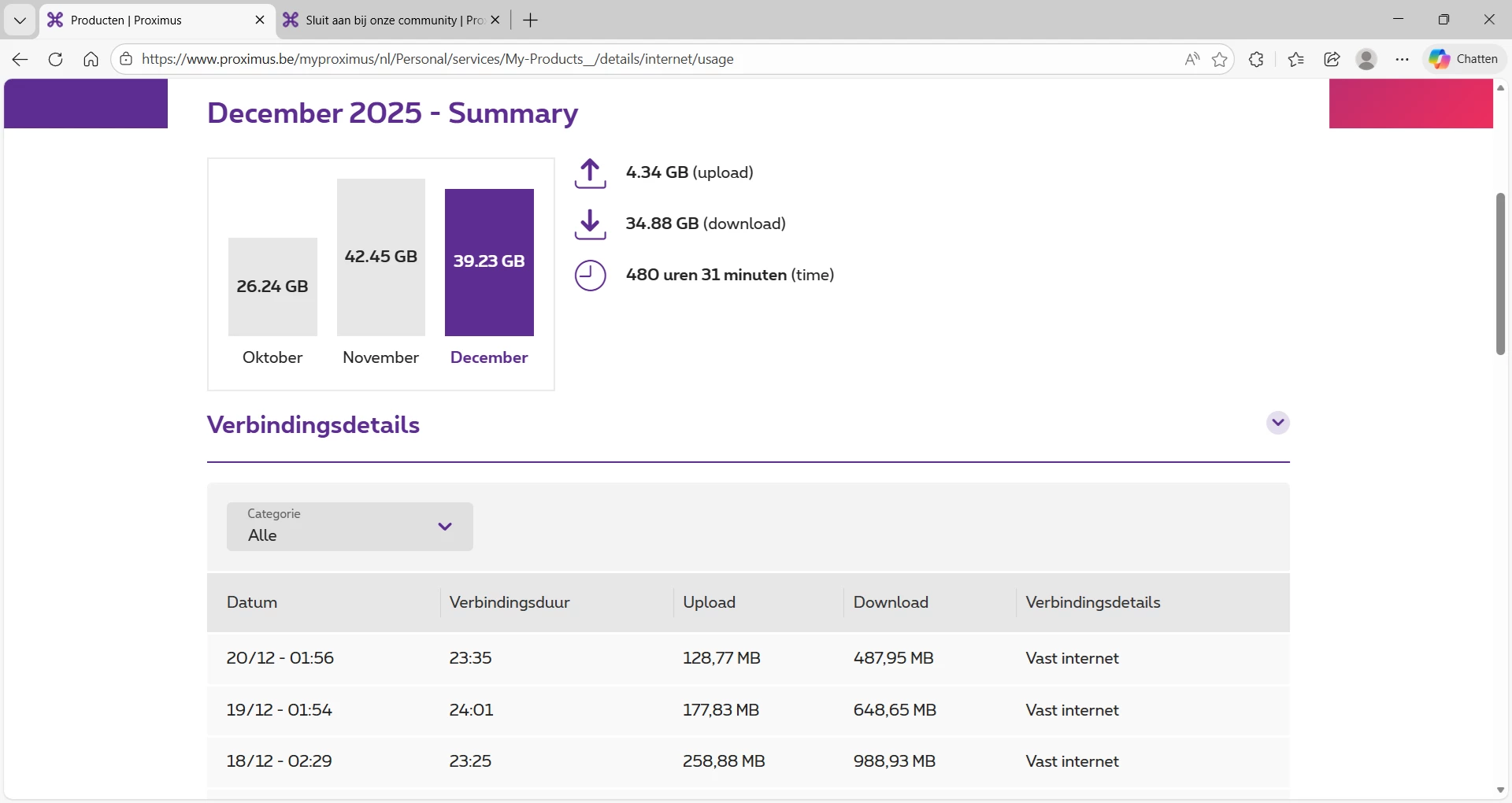 Als ik de optelsom maak van de verbindingsdetails kom ik voor December (tot op heden 21/12) ongeveer aan 35 GB down en 4.5 GB up wat uiteraard niet in de buurt komt van de December (tot op heden) 84.6 GB data