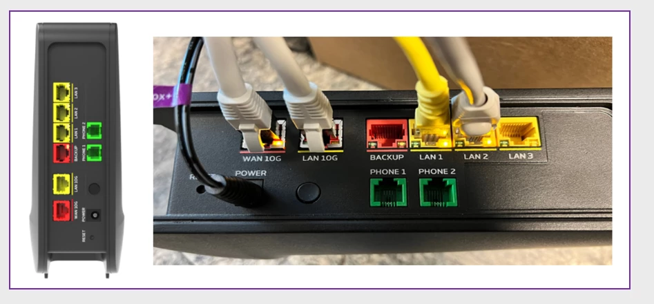 De fiber kabel komt binnen in het ont boxje, en kabel vanuit ont-box gaat naar het rode poortje in je internet+ modem (WAN / 10Gbps).