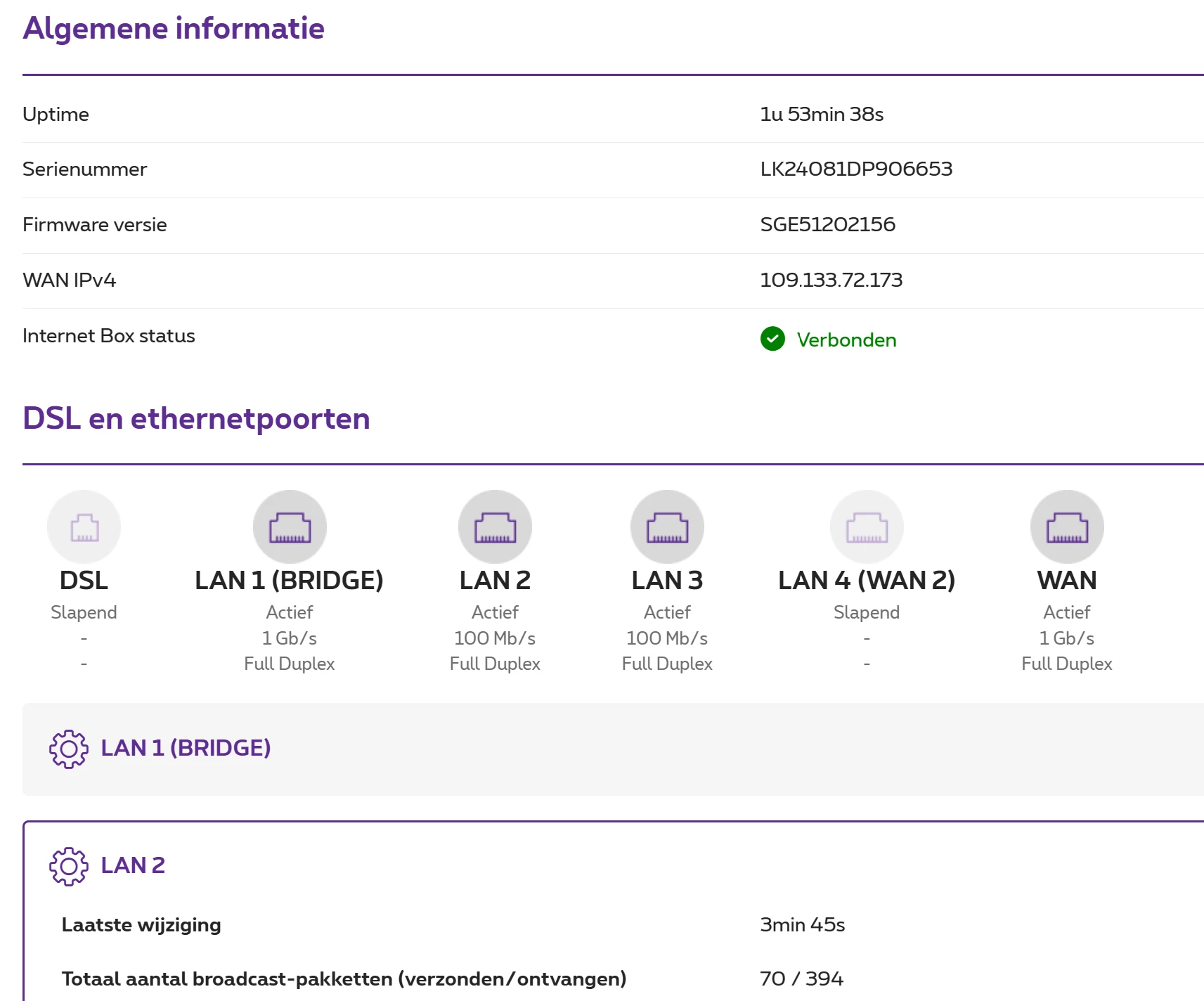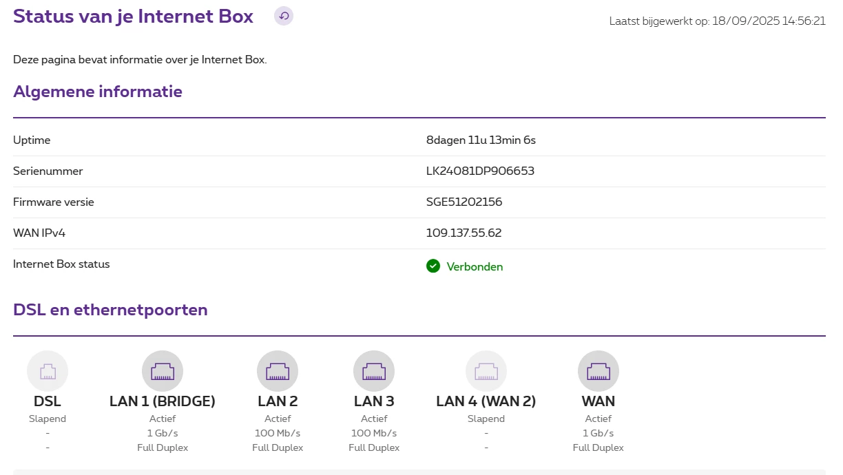 Echter, soms op LAN 1 en vaak op LAN 2 valt de poortsnelheid op de Internet Box van 1 Gbps terug naar 100 Mbps zonder enige aanleiding. Het is een CAT 6 bekabeling en alle toestellen hebben een 1 Gbps poort. Wanneer de Internet Box wordt herstart, dan is bij opstart de poortsnelheden 1 Gbps en dit kan soms enkele uren/dagen in orde zijn maar heel vaak valt op de poort met AP de snelheid terug naar 100 Mbps.