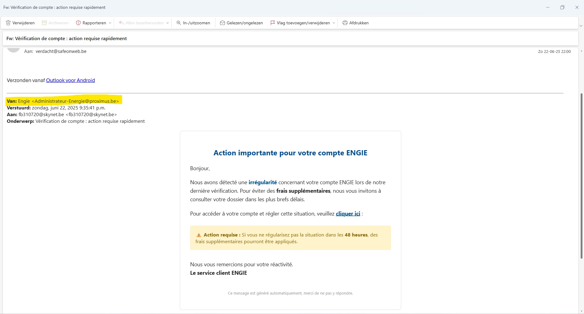 Een tweede probleem is een verdachte mail met domeinnaam proximus.be.