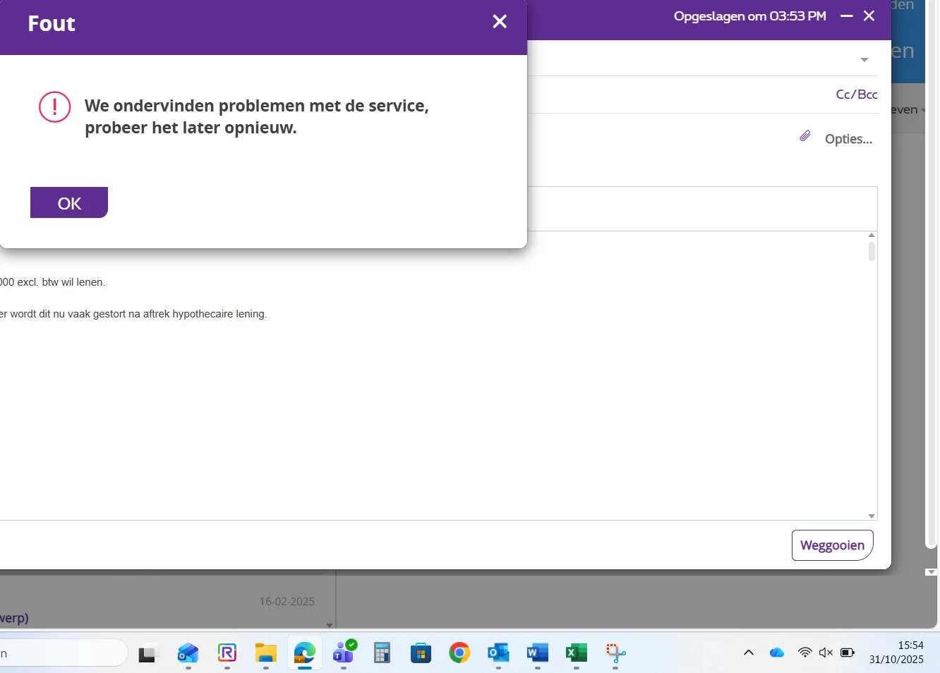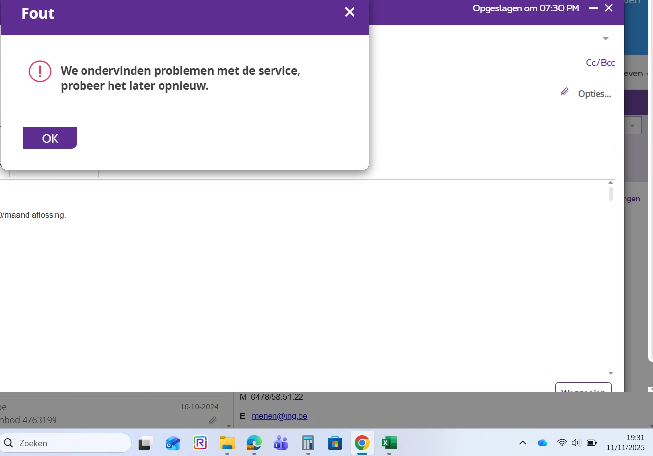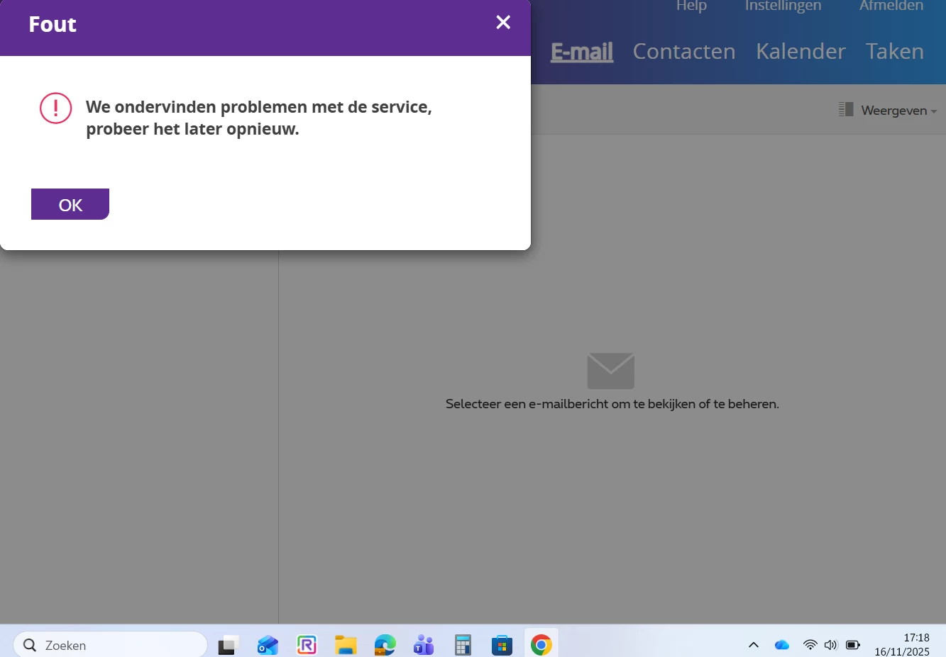 Telkens ik een mail wil opstellen of een zoekactie wil doorvoeren krijg ik de pop up dat er problemen zijn met de service.