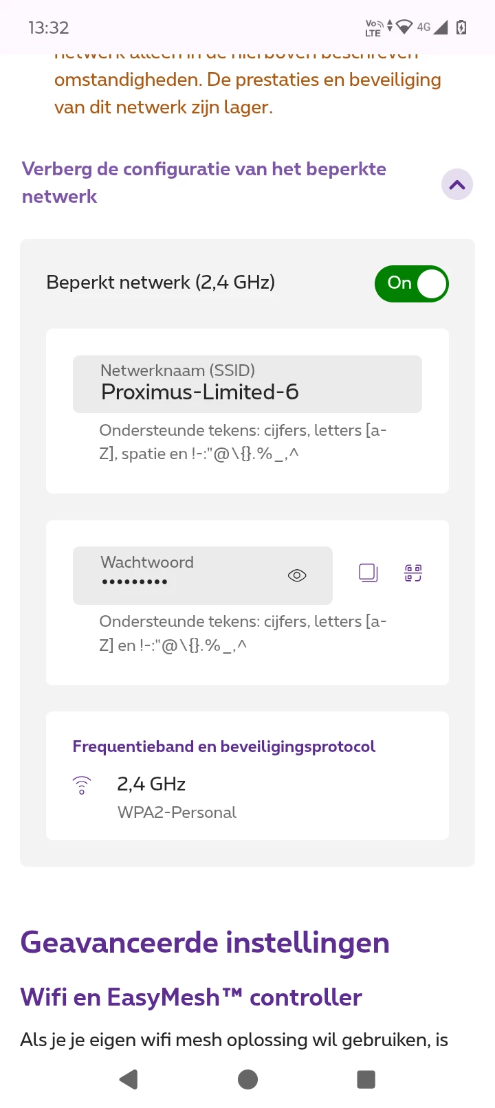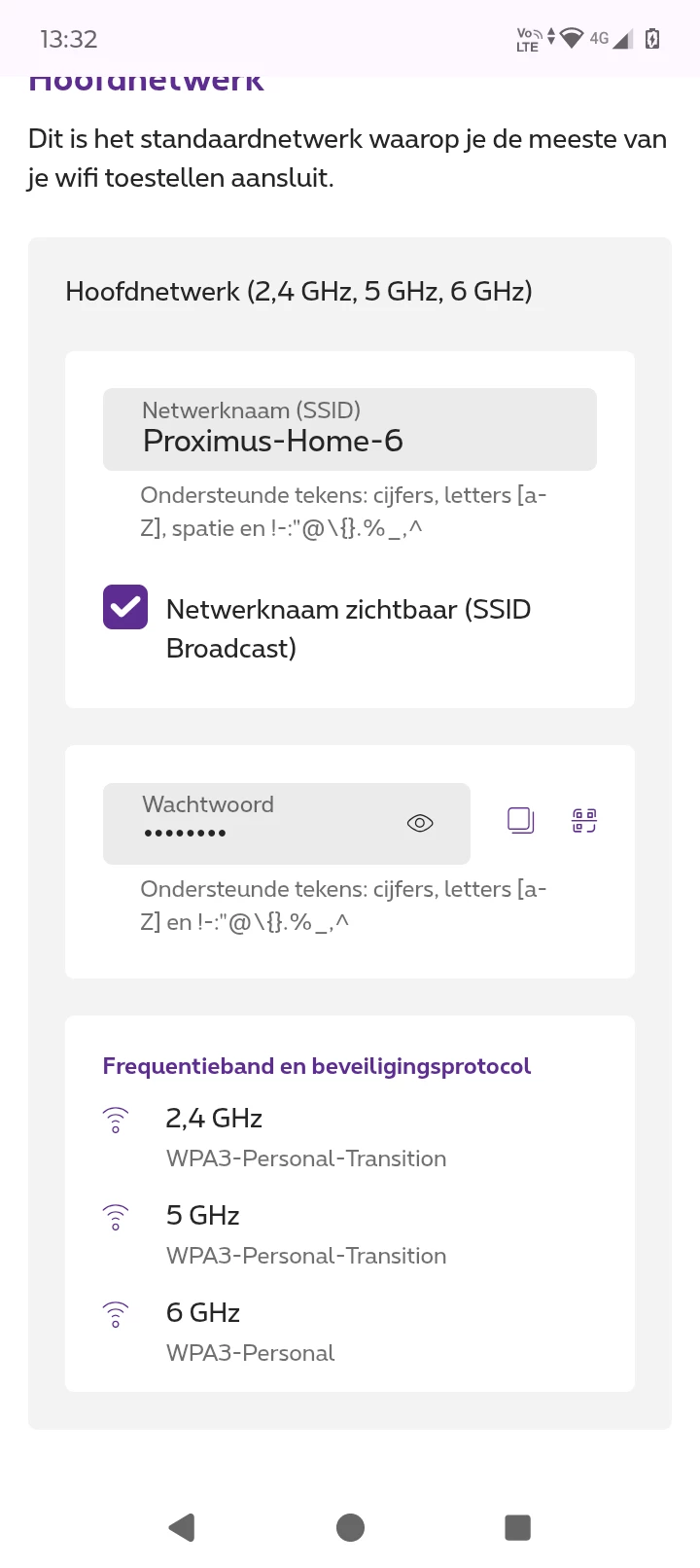 Ik heb de Proximus internet+ box zie dat ik 2.4 GHz , 5ghz , 6,GHz heb ik heb een vraag heb een deurbel die enkel werkt op 2.4 GHz gebruikt de limited naam en wifi paswoord staat op 2.4 GHz volgens mijn smartphone naar als ik mijn deurbel wil verbinden geeft die mij de naam limited aan en geef wifi WW in en ga de verder voor instellen naar lukt niet heb al 3 deurbellen met camera gekocht geen maakt connectie is er een mogelijkheid dat ik mijn 5 GHz even kan uitzetten en dan terug inschakelen aub via mijn instelling wifi heb gezien naar vindt nergens de mogelijkheid of ik kijk erover graag hulp ervoor .