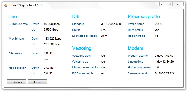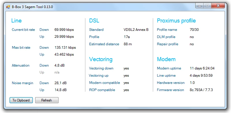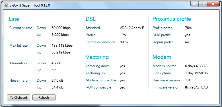 Toen ik merkte dat ik een lage upload had van 4Mbps wat voorheen 12.5Mbps was nam ik een kijkje met het bekende BBox3 Sagem Tool.
