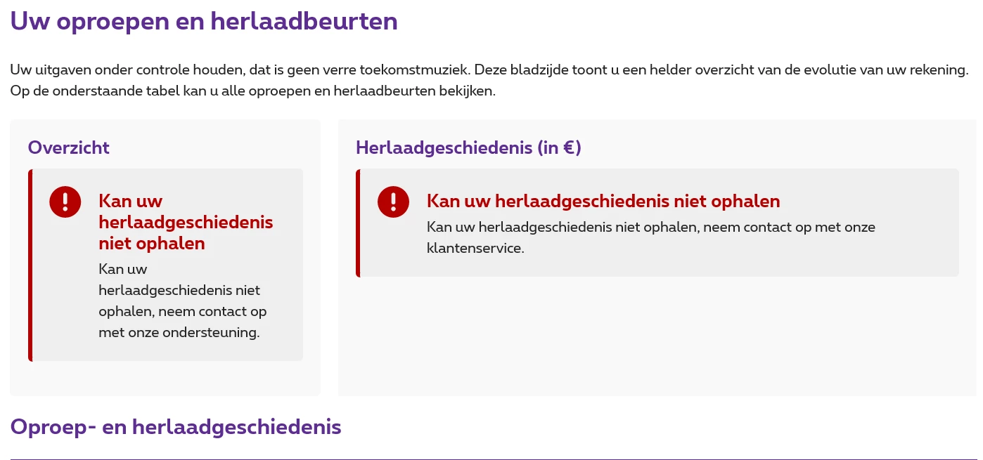 “Sedert meerdere weken werkt de oproep- en herlaadgeschiedenis van My Proximus niet meer voor mijn gsm. Blijkbaar zou deze dienst afgeschaft zijn voor pay en go klanten. 25 jaar al gebruik ik deze dienst, weliswaar af en toe met problemen, maar nu zou het definitief afgeschaft zijn. Mooi verjaardagscadeau.”
