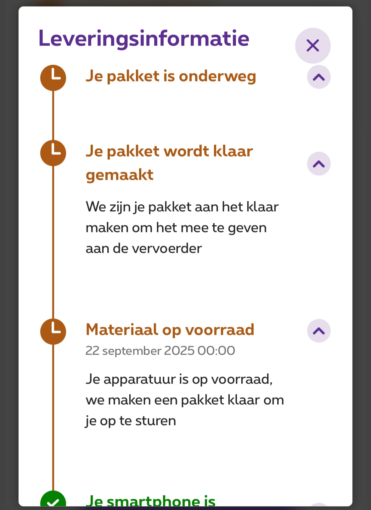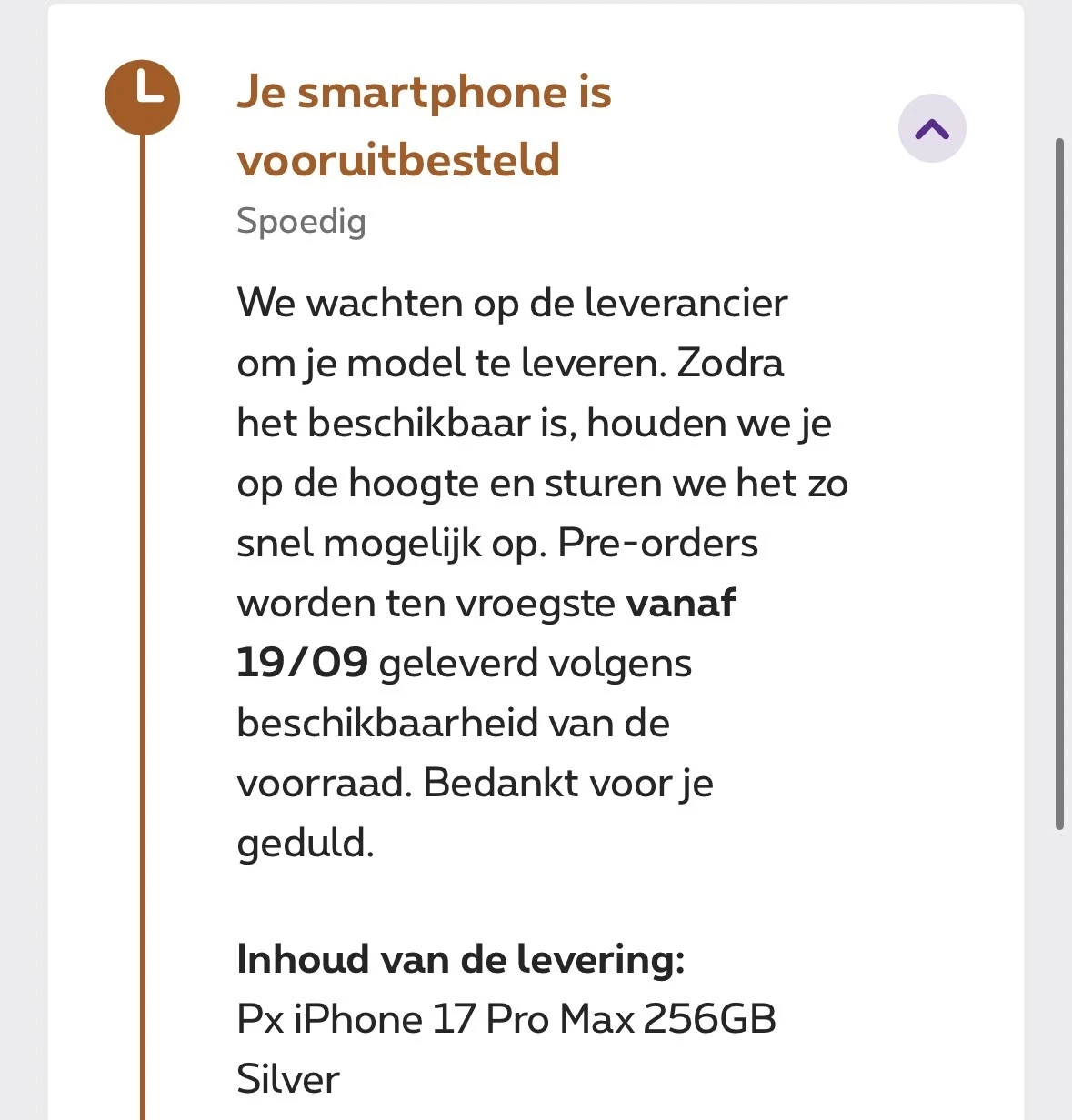Op 13 september een iPhone 17 Pro Max besteld. Volgens de bevestiging was het toestel op voorraad en zou het op /vanaf 19/09 geleverd worden.