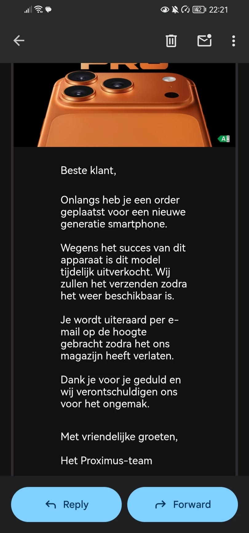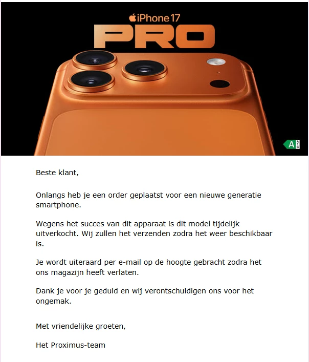 Ik heb gisteren eindelijk mijn iphone 17 pro silver 256gb ontvangen, zonder enige communicatie van proximus zelf, enkel een email van bpost.. had preorder gedaan op 13/9. Mijn vriend had de oranje versie de 12de gepreorderd en 19/9 ontvangen..