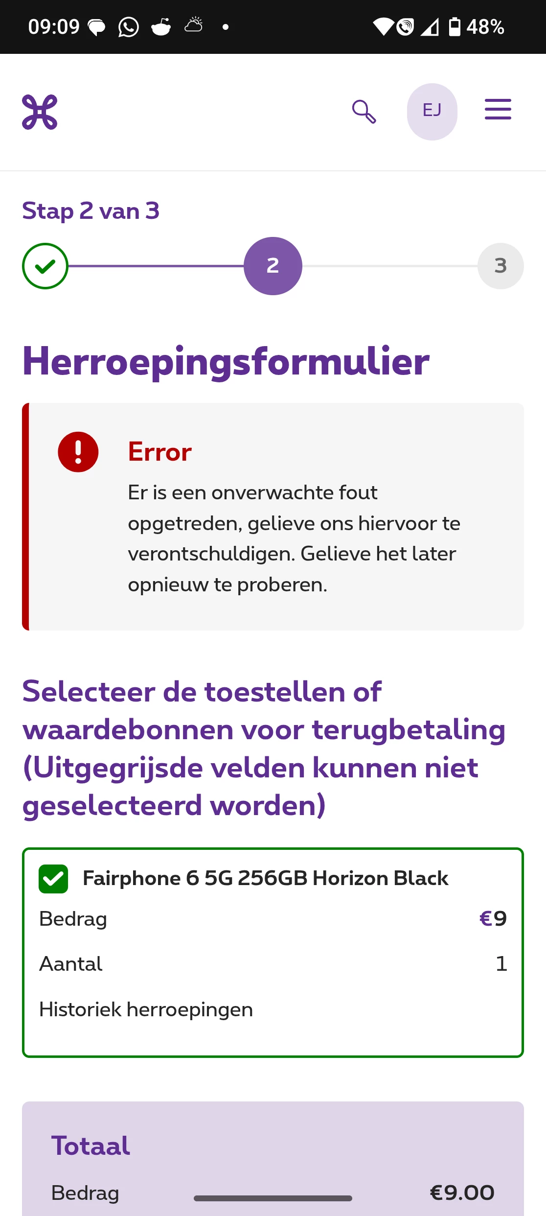 Voor order R4WEBSHOP047391405 probeer ik het herroepingsformulier te gebruiken, wanneer alle gegevens ingevuld zijn krijg ik een foutmelding" error er is een onverwachte fout opgetreden".