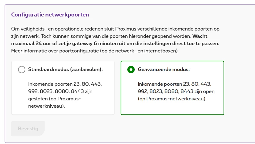 Via Support raak ik niet verder, de medewerker ging in eerste instantie een nummerportering starten toen ik over port forwarding sprak… Vervolgens de wss wel gekende antwoorden zoals “je zal een ICT expert moeten contacteren” en “hiervoor geven wij geen support”