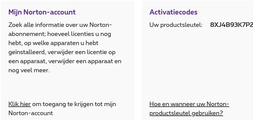 Ik probeerde reeds op basis van de productsleutel uit MyProximus het abonnement te heractiveren, op mynorton, doch dit lukt niet daar een productsleutel van 25 posities vereist is en de productsleutel van op MyProximus slechts 13 posities vermeldt.